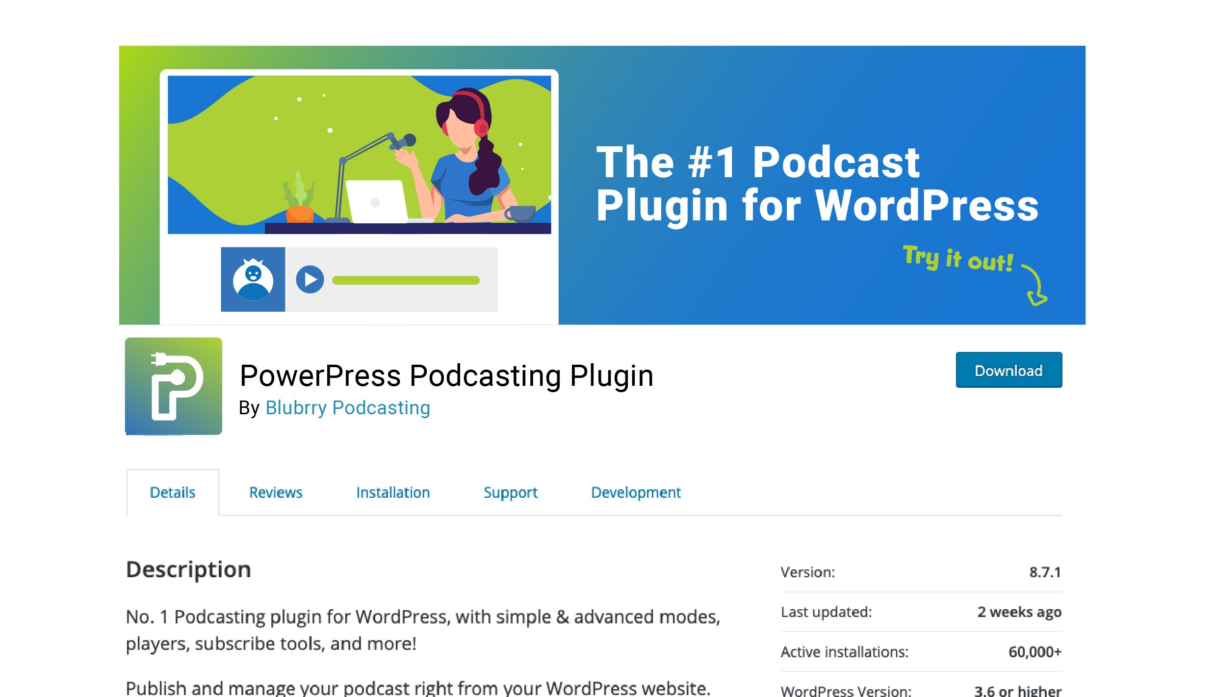 PowerPress is the #1 podcast plugin on WordPress. It provides a low entry barrier to WP users to begin podcasting for free. Users can add podcast RSS feed content to their current website create a new website for their podcast show.